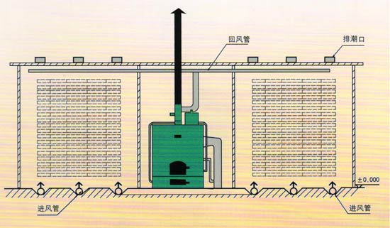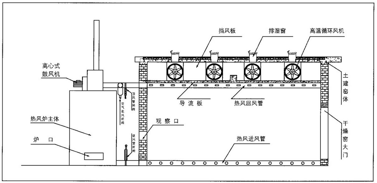 熱風式干燥設備工作原理是利用燃燒產生的熱能,加熱窯內的空氣,由熱風爐頂部主風機將窯內的空氣通過管道吸入爐體,將空氣加熱。再通過管道,送入窯內,由窯內的循環(huán)風機不斷的循環(huán)對窯內的木材均勻加熱。木材干燥過程中如需要蒸汽,可由熱風爐內的蒸汽發(fā)生器提供,如果是一爐兩房或多房時,管道上裝有插閥,通過插閥的調節(jié)來控制窯內的溫度。在干燥的過程中,由于木材要進行排濕,在窯頂上留有排濕孔(根據(jù)地區(qū)而定)和裝有抽濕機,用來調節(jié)排濕的快慢.